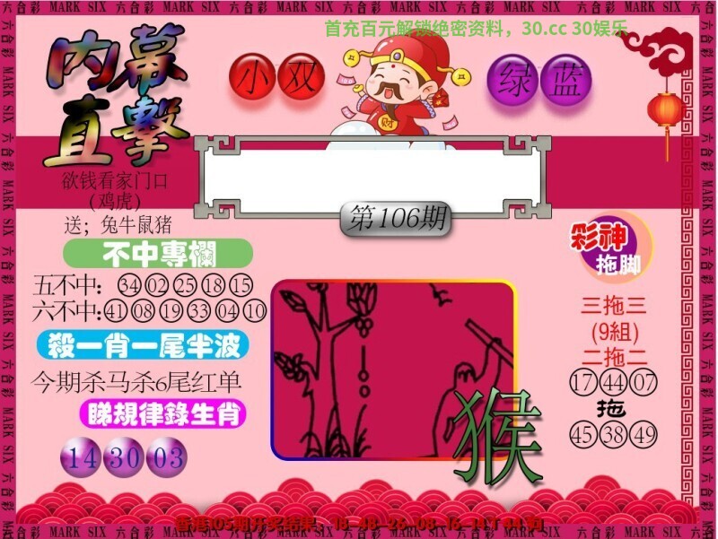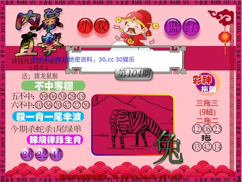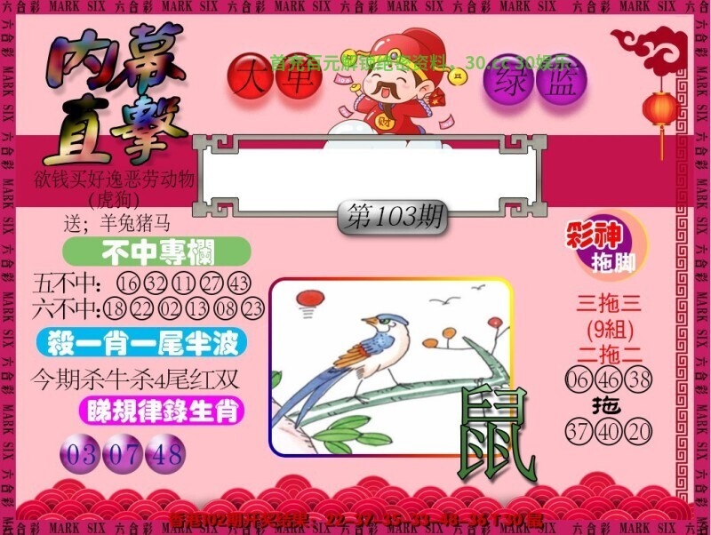 102期九肖 | 虎猴猪羊牛马鼠鸡兔 | 鼠30中 |